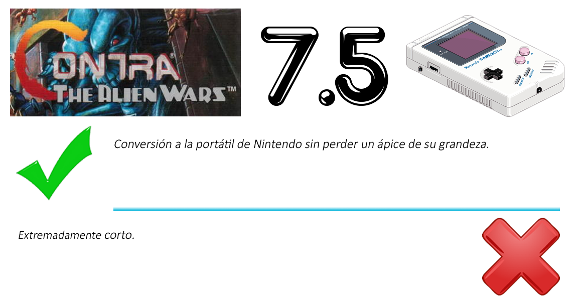 Contra: Alien Wars es demasiado corto, pero es tan tremendamente divertido que se convierte en uno de mis juegos favoritos de Game Boy. La única razón por la que este Contra no figura entre lo mejor de la portátil de Nintendo es que se trata únicamente de una adaptación del mítico Contra: Alien Wars de Super Nintendo y no un juego exclusivo/propio como tal.