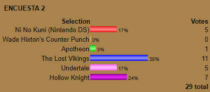 De hecho el juego que te iba a proponer y que voté en esa encuesta era el Hollow knight, y también tenía en mente votar juegos como undertale, lost vikings, injustice o Mario sunshine, pero todos acabaron en las mismas encuestas.